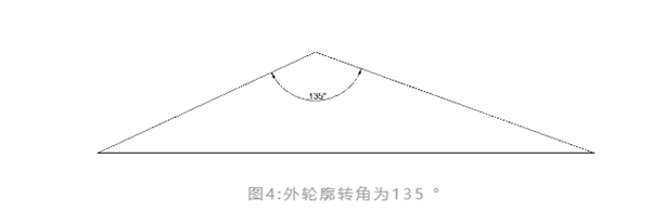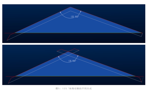 當轉角是鈍角或是超過一定角度(這個角度在編程軟件里可設置)的時候,切割頭可以直接通過旋轉達到相鄰線段所需角度。如圖4所示,對于135 °的外輪廓,當我們在軟件里面設置好轉角回路閾值,在出程序時,就可以決定我們是直接成型,還是重新打孔加引線兩次成型。