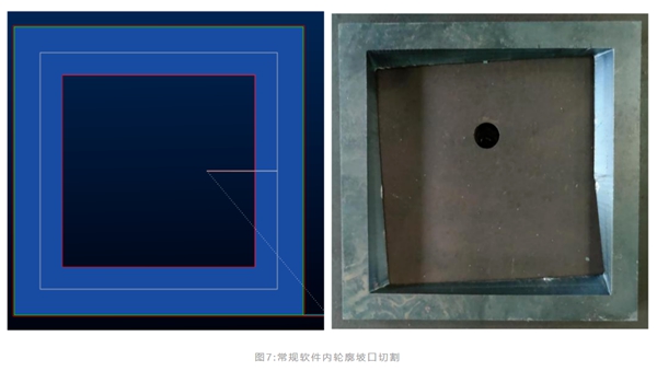 但實際切割時可以發現,轉角處切割頭旋轉速度很慢,不能立刻旋轉到相鄰邊所需的角度,導致切割頭一邊切割一邊旋轉,最終形成了漸變坡口的成型狀態,無法滿足加工需求。實際上,內輪廓90°轉角坡口切割一直是行業難題,因為常規軟件不能準確計算出切割頭轉角運動時的G代碼,所以內輪廓轉角切割也一直沒有得到很好解決。