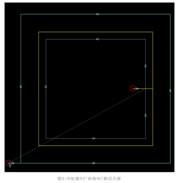 針對以上問題,華工激光軟件開發人員改進軟件算法,突破切割頭路徑規劃和G代碼生成兩大難點,在內輪廓轉角處生成新的程序,滿足內輪廓坡口拐角切割一刀成型的需求。在編寫內輪廓90°轉角程序時,將引入線放在內輪廓一邊中點處,模擬NC路徑如圖8所示。