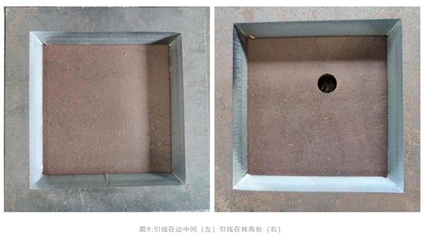 在實際切割過程中,內輪廓的轉角處切割頭可以快速轉到相鄰邊所需角度,切割過程中,保證每個邊的坡口角度一致,并且轉角處成型良好。圖9為10mm鐵板內輪廓轉角切換狀態,將引入線放到內輪廓轉角處,可以看到內輪廓4邊坡口角度一樣且切割面質量更好,無引線痕跡。