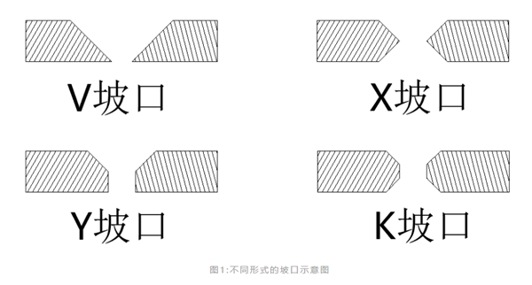 根據材料厚度和焊接質量需求,市面上主要的坡口形式有V型坡口、Y型坡口、X型坡口、K型坡口,如圖1所示。V坡口和Y坡口是單面焊接,切割和后期焊接過程都較為便利,缺點是焊后容易變形。當焊件厚度增大時,一般采用X坡口或K坡口,同樣厚度下可減少焊縫金屬量約1/2,對稱施焊,焊后變形小,缺點是焊接過程中要翻轉焊件,在筒形焊件的內部施焊,需耗費一定的時間、人力成本。