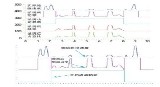激活坡調(diào)功能后,根據(jù)實時數(shù)據(jù)采集可以看出激光器實際輸出功率、頻率、占空比均可以跟隨路徑速度實時變化,三種坡調(diào)功能可根據(jù)實際需求分別開啟,對比工件實際切割效果,切割毛刺改善明顯。