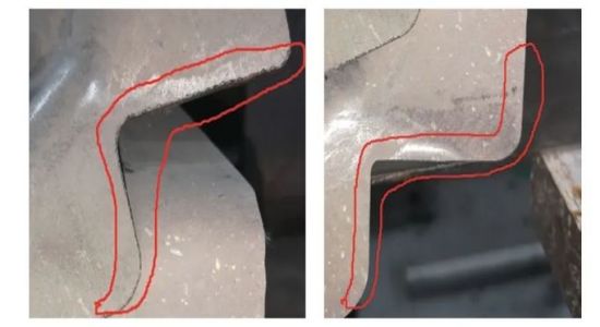 零件實際生產(chǎn)過程中,受熱壓回彈、投料等因素影響,工件存在不同的狀態(tài),數(shù)模編程與實際工件存在一定誤差,是導致拐角(圖8)質(zhì)量較差和燒傷的原因。