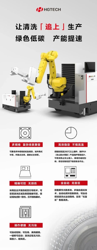 華工科技自主研發的“輪胎模具激光清洗智能裝備”攻克了激光器、清洗頭、視覺引導技術等多項核心部件與工藝,無懼高溫“烤驗”,“不拆模”也能讓污垢一掃而光,最快45分鐘即可在線清洗一副輪胎模具,可有效解決傳統清洗方式中“待機時間長、反復拆卸、模具磨損、清洗不徹底、環境污染、能耗高”等痛點、難點問題,從而減少硫化機停機時間,提高生產效率及輪胎質量,開啟了輪胎模具清洗“低碳、自動化”新時代。