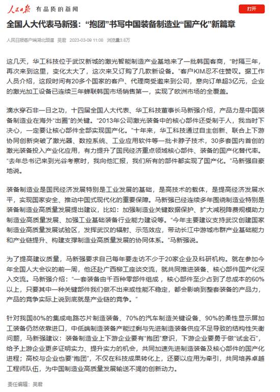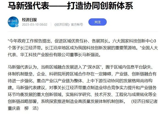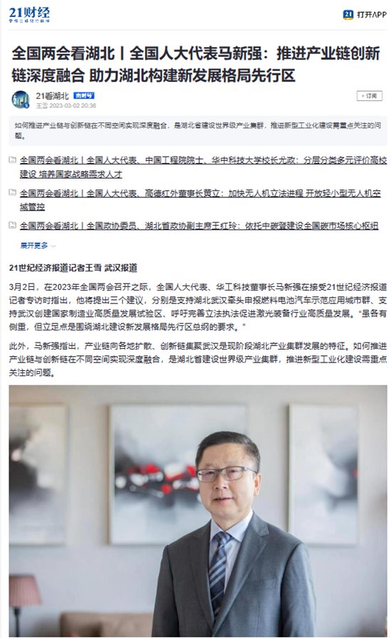 《人民日報》、新華網、央視綜合頻道、中國國際電視臺、21財經、《經濟日報》、《證券時報》、《中國證券報》、中國工信產業網、湖北衛視、《湖北日報》、《長江日報》等多家媒體關注馬新強代表的履職情況及華工科技創新發展。