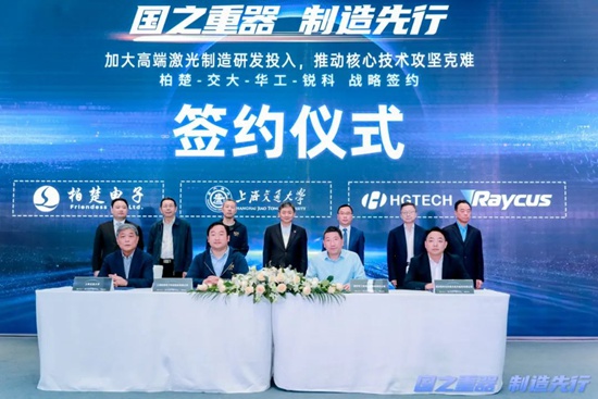 上海交通大學黨委委員、副校長張安勝,柏楚電子聯合創始人、激光業務總經理謝淼,銳科激光副總經理李杰,華工激光總經理鄧家科代表簽約。