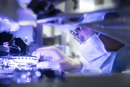 走進(jìn)華工正源光子技術(shù)公司生產(chǎn)車間,只見儀器指示燈閃爍不停,身著防塵服的技術(shù)人員正仔細(xì)操作設(shè)備,完成一支支高端光模塊的裝配、質(zhì)檢。這些光模塊經(jīng)過-40℃至85℃高低溫循環(huán)測試后,將交付到全球主流通信設(shè)備商手中。