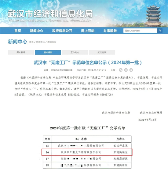 近日,武漢市信息和經(jīng)濟(jì)化局和武漢市生態(tài)環(huán)境局公示武漢市“無廢工廠”示范單位名單(2024年第一批),華工激光正式獲批成為武漢市“無廢工廠”示范單位。