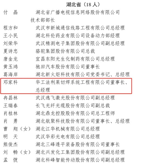 近日,工業(yè)和信息化部對(duì)全國(guó)工業(yè)和信息化系統(tǒng)先進(jìn)集體、勞動(dòng)模范和先進(jìn)工作者擬表彰對(duì)象名單進(jìn)行公示,華工科技核心子公司孝感華工高理電子有限公司(以下簡(jiǎn)稱“華工高理”)入選“全國(guó)工業(yè)和信息化系統(tǒng)先進(jìn)集體”,華工科技子公司華工法利萊切焊系統(tǒng)工程有限公司(以下簡(jiǎn)稱“華工法利萊”)董事長(zhǎng)、總經(jīng)理鄧家科入選“全國(guó)工業(yè)和信息化系統(tǒng)勞動(dòng)模范”。