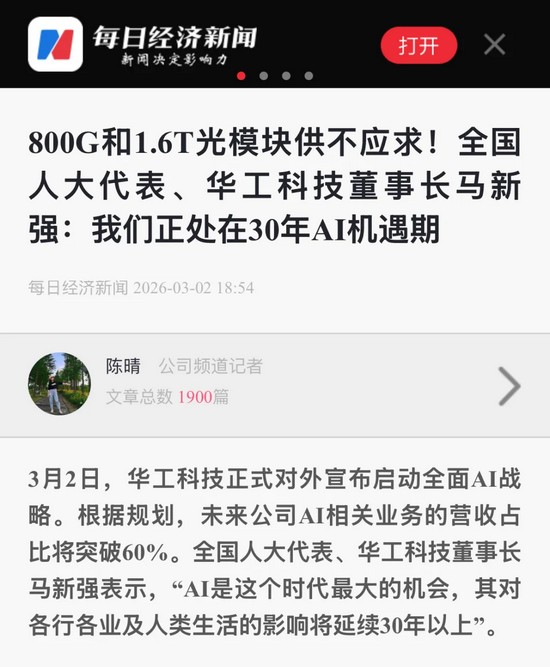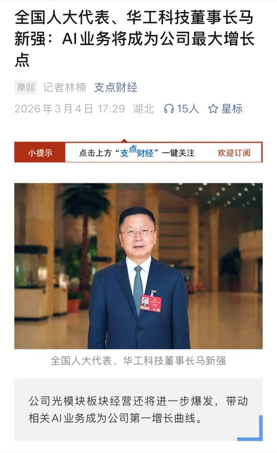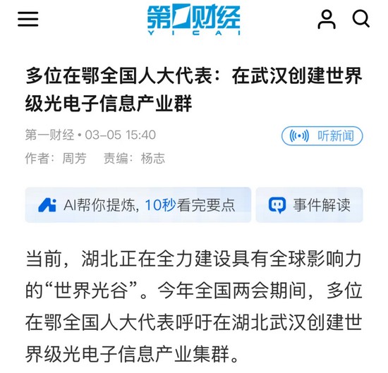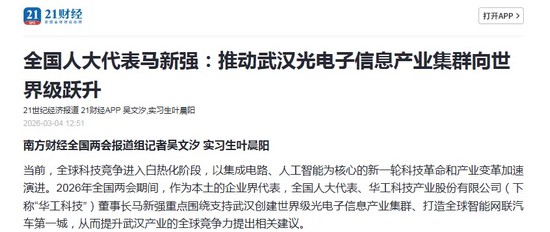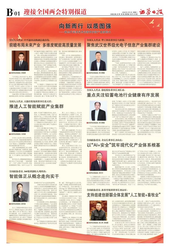 人民日報(bào)《兩會(huì)特刊》、新華社《新華每日電訊》、證券時(shí)報(bào)、證券日報(bào)、上海證券報(bào)、21世紀(jì)經(jīng)濟(jì)報(bào)道、每日經(jīng)濟(jì)新聞、經(jīng)濟(jì)觀察報(bào)、第一財(cái)經(jīng)、支點(diǎn)財(cái)經(jīng)、湖北日報(bào)、長江日報(bào)等多家媒體關(guān)注馬新強(qiáng)代表的履職情況及華工科技創(chuàng)新發(fā)展。