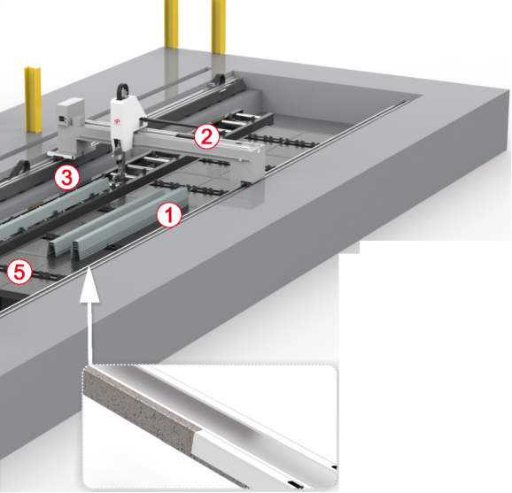 ⑤ 清洗作業完成后,U肋原路返回上料區域,由移載機構 進行卸料。U肋進入存放架,至此一個作業循環完成。